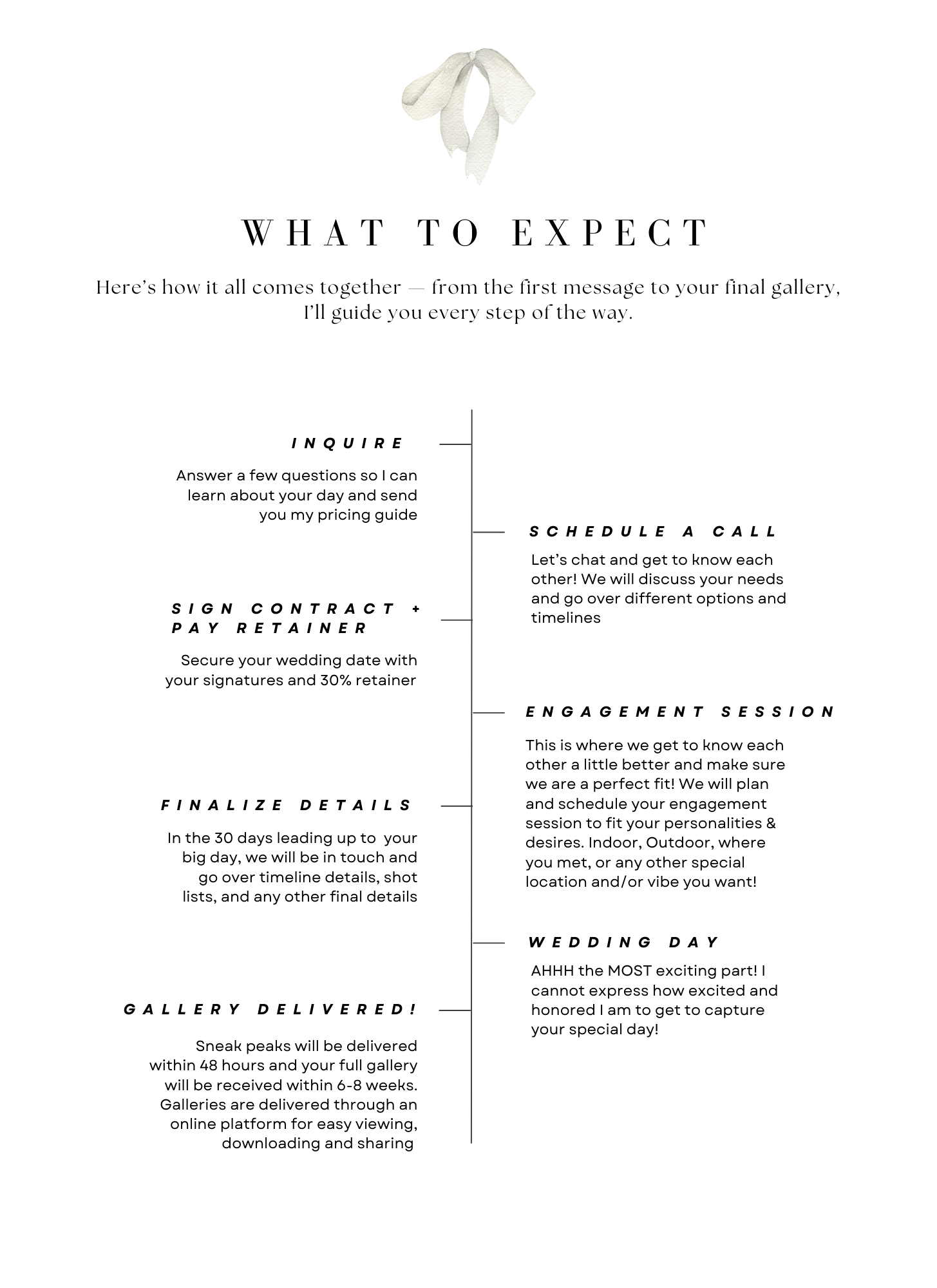 After you inquire, I will confirm my availability and send over my pricing guide, then we will have a wedding chat to see if we are a good fit, and then you can lock in your special day with a 30% retainer and a signed wedding contract!